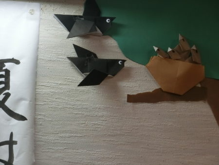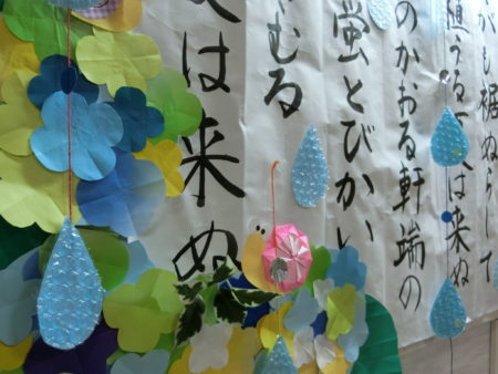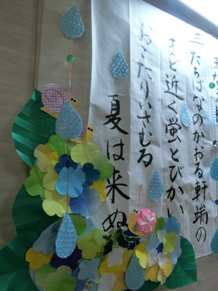 軽費老人ホームのラウンジでは、季節のしつらえを行っています。書道クラブによる「夏は来ぬ」の書とスタッフによる色紙やグッズを使ってのアートのコラボレーションです。