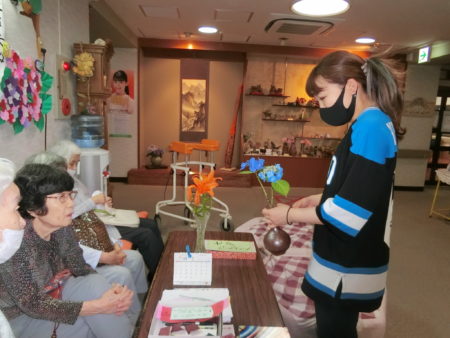 こちらの紫陽花は近隣で咲いたものです。スタッフが摘んできて一輪挿しに活けました。「きれいな色やなー。私はブルーの紫陽花が一番好きやわ~」などと季節の風を楽しんでらっしゃいました。