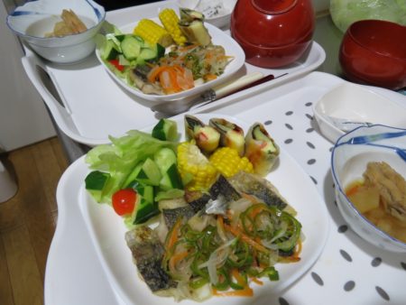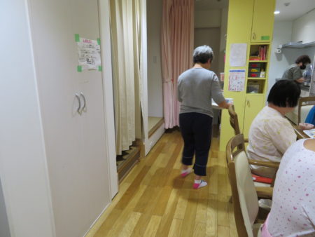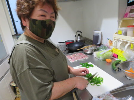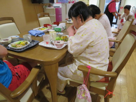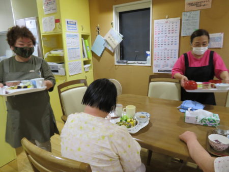 豊年福祉会には2軒のグループホームがあります。『ホームきらら』には女性5名、『ホームかがやき』には男性5名が暮されています。2軒のグループホームの食事は完全にスタッフの手作りです。今日は、7月のある日の夕食をご紹介します。午後4時半ごろ、ご利用者様が帰宅される時間です。『ホームきらら』のいつもの風景です。「ただいま~あーお腹空いたなー!」