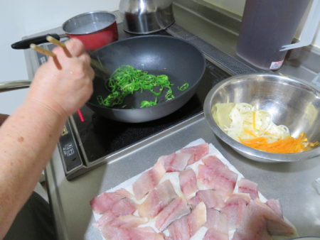 スタッフが4時前から夕食の準備に取り掛かっています。今日もメニューは『アジの南蛮漬』がメインです。千切りにしたピーマン、玉ねぎ、にんじんを用意しておきます。