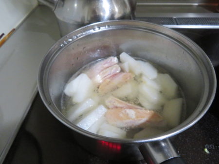 こちらは煮物―本日は『大根と鶏肉の煮物』です。大根は食べやすいように薄く切り、下ゆでのあと鶏肉と煮ます。アクを取り、だし、砂糖、しょうゆ、でコトコト煮込んでいきます。