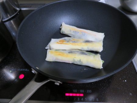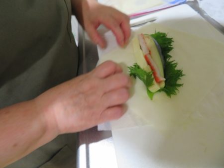 さて、食事に話題を戻しましょう。こちらはナス、チーズ、青シソ、カニかまぼこの春巻きです。