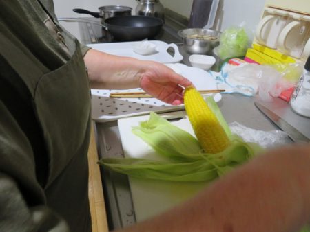 つけあわせの野菜、、、、あ!そうそう、とうもろこしはご利用者様みなさんの大好物!確か冷蔵庫にあったはず?。。ありました!電子レンジでチン!!