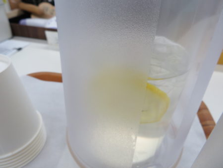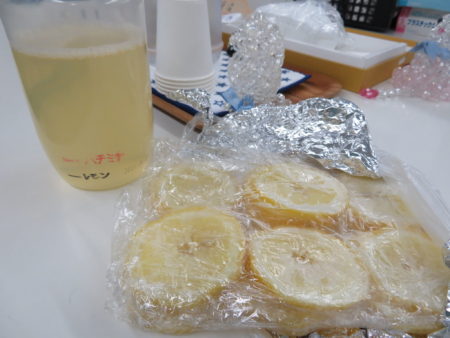 では、ひとつひとつ説明をします。こちらは、熱中症予防ドリンクで、生のレモン、はちみつ、天然塩で作られています。はちみつの容器に誰もが作ることができるように黒と赤のマジックでラインが引かれています。「ここまで入レモンとはちみつを入れてね!」そこにぬるま湯を入れて原液が出来ます。レモンは輪切りにして凍らせてあります。