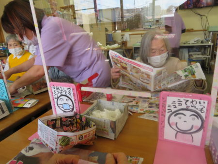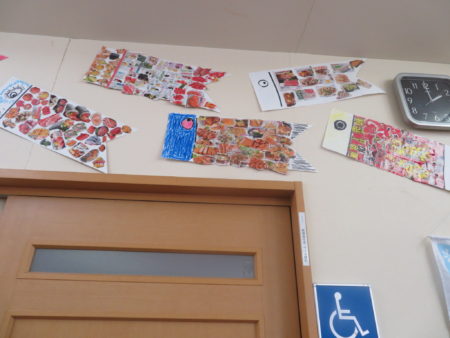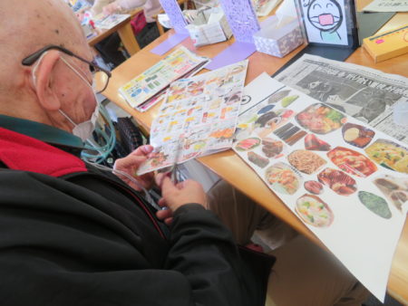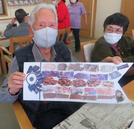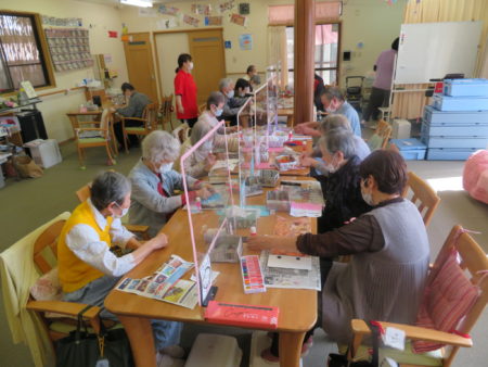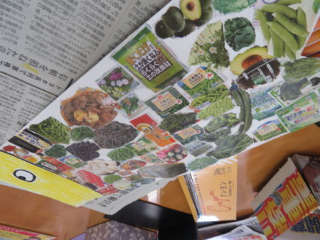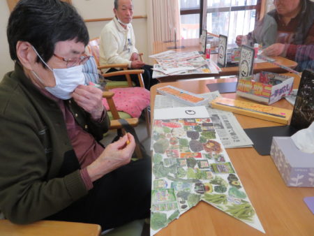 何をしているかと言いますと。。。。広告紙を使い、ちぎり絵で鯉のぼりを作っているのです。この方は緑色の野菜を集め、ちぎったり、ハサミで切ったりしてはペタッと貼り付けていきます。