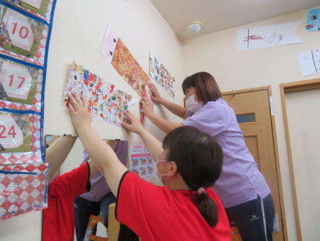 さあ、出来たてホヤホヤの作品を高い場に貼っていきます。こちらはスタッフにお任せあれ!皆さんの力作、デイサービスセンターきさべで泳いでくださいね!