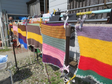 こちらは冬の間、防寒用に椅子の足もとに巻くニットの作品で、スタッフのお母さんの手作りなんです。暖かくなってきたので今年のお仕事は終わりにしましょう。しっかり洗い、お日様の下に干し、冬眠ならぬ、春夏眠です!