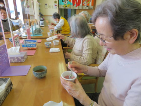 クラフトの時間も終わり、スィーツのひとときです。今日は桜色したゼリーです。イチゴゼリーかな?