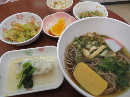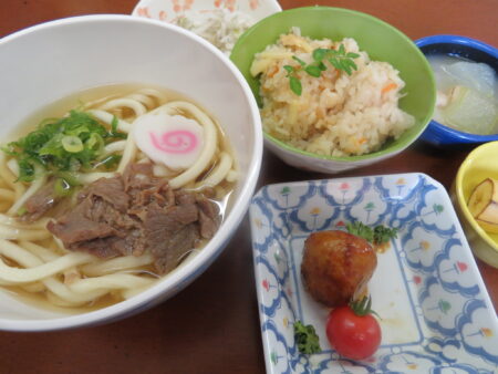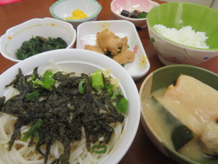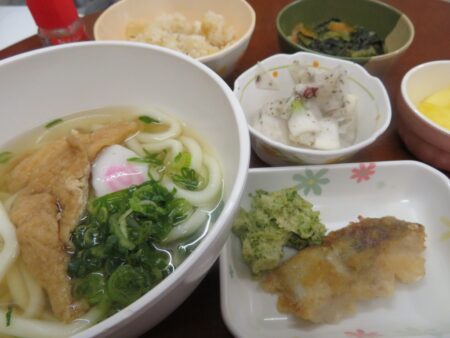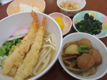 豊年福祉会の職員給食の献立には月に3~4回麺類が登場します。「今日は麺類!」と聞いたらテンションが上がる職員が多くいるんです(笑)みんな大好き・麺類なのです。この日は天ぷらうどん―エビの天ぷらが2本乗った豪華版です。他には鶏の団子や青菜のお浸しなど。