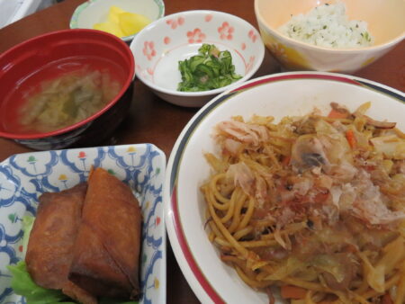 かつお節ユラユラ~豚肉と野菜たっぷりのソース焼きそばの日もあります。春巻きも付いていてボリュームありました。男性職員は大喜び!!