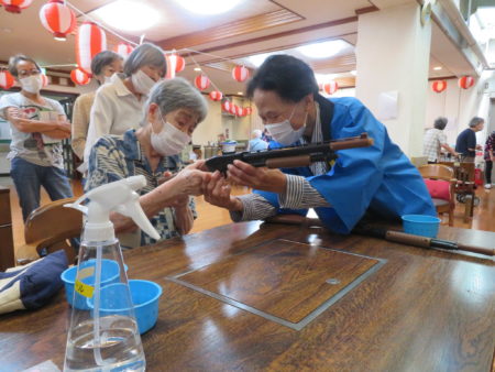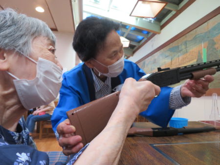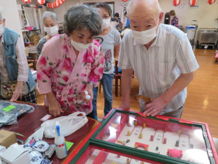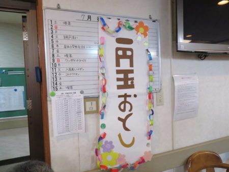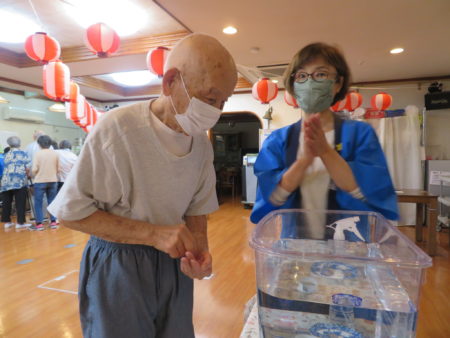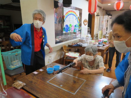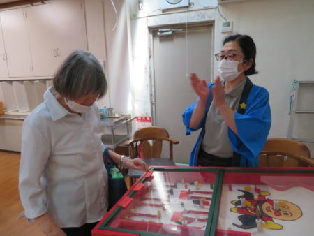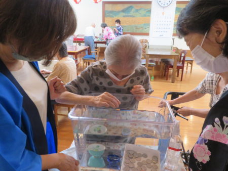 コロナも落ち着いてきたとはいえ、まだまだ油断できない日々、ご入居者様に楽しいひとときを過ごしていただこうとスタッフが「縁日会」を企画しました。スタッフと一緒に楽しんでいただこう、ということも目的のひとつです。まずは「一円玉おとし」からスタート!