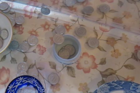 ご覧ください!こんな神業を成功させて方がいて!よーくご覧ください。盃のヘリに一円玉が乗っているのです^^v 皆さんから歓声が挙がりました。