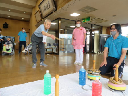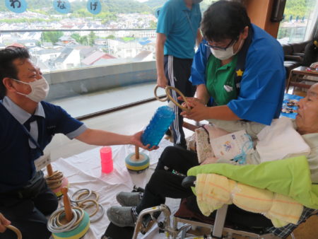 まずは「輪投げ」コーナーです。輪投げは目標を見極める目の力、身体を保つ筋力やバランス力が必要なので、全身に効果があるとされています。輪が目的の物に入ると嬉しく、満足感が得られ、この日も皆さん夢中でした。