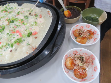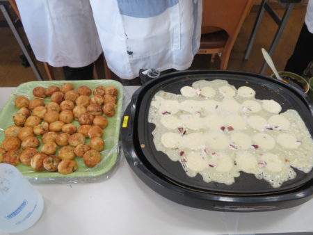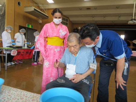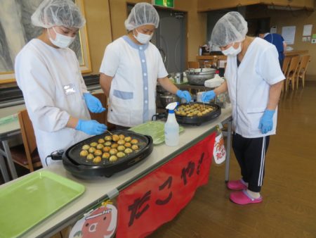 さて、こちらは栄養課の「たこ焼き」コーナーです。ご入居者様が「食べたい!」とおっしゃっる人気のたこ焼きなので、夏祭りに栄養課に応援を求めて出店をしてもらいました。ちょうど管理栄養士の実習生さんが来られていましたので、クルクルと焼いてもらいました。
