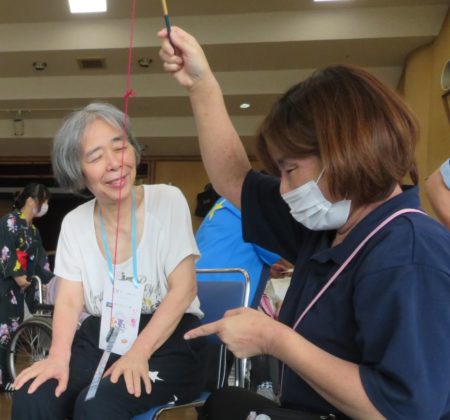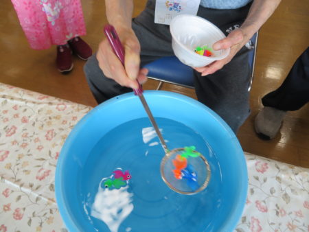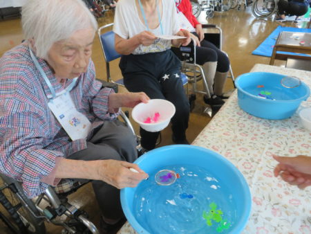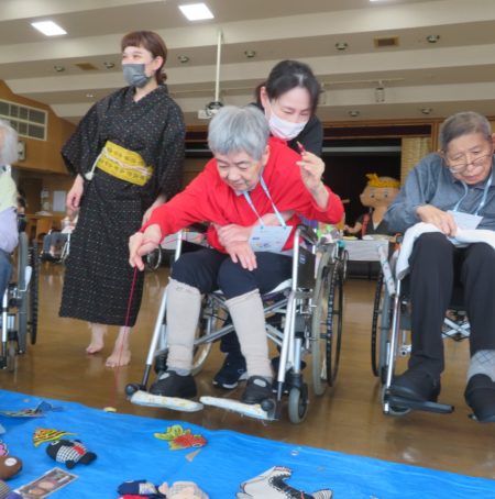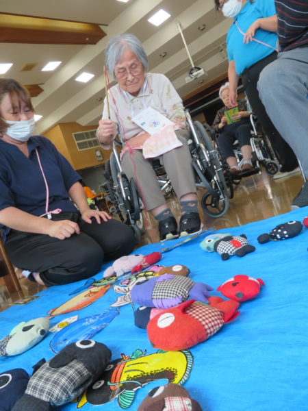 こちらは「魚釣り」です。「明星釣り堀」にはたくさんの魚が泳いでいます!お祭りが始まる前には「お部屋にいます、行かないよ~」とおっしゃっていたご入居者様もいざ、ゲームを前にすると笑顔になられたり、身体が前のめりになったり、真剣な表情になられたり、アクティブなご入居者様の姿が垣間見れました。