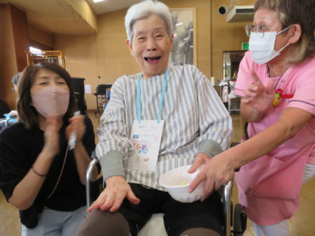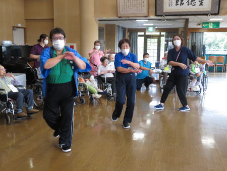 ラストを飾るは「盆踊り」です! 「江州音頭」「炭坑節」「河内音頭」をスタッフ、ご入居者様と一緒に踊りました。スタッフの身体には全ての踊りが染みついています♪ 「なんだって踊れますよ~!私に付いてきてくださいね!」