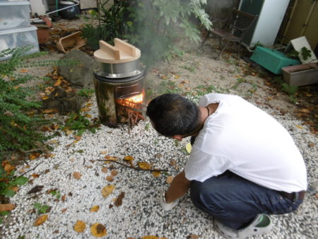 13時50分、軽費老人ホームの施設長が中庭で火を起こします。
